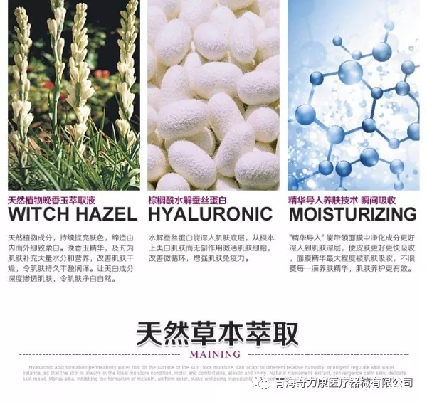蠶絲本身蘊含18種氨基酸,有效補充肌膚組織彈性蛋白與膠原蛋白質(zhì),消除面部細紋,迅速改善皮膚的彈性,復(fù)活細胞,防止黑色素形成,增白肌膚。