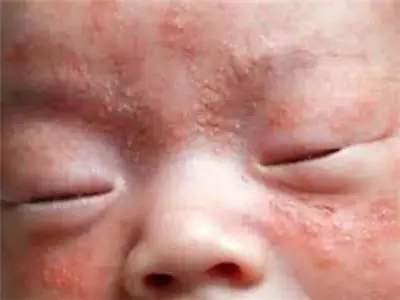 表現(xiàn)為皮膚潮紅,小斑丘疹上溢出淡黃色脂性液體覆蓋在皮疹上,以后結(jié)成較厚的黃色痂皮,不易除去,以頭頂及眉際、鼻旁、耳后多見,但是癢感不太明顯。